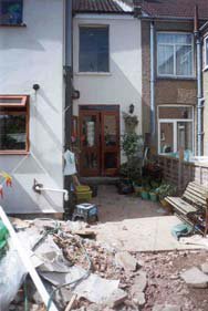 Rear garden: The rear garden beyond the patio/yard has a surface of rough cast and broken concrete.