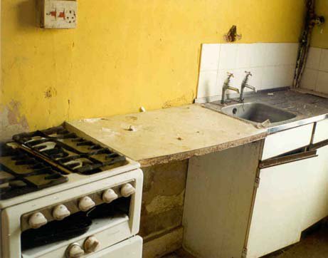 chipboard spanning between the sink and cooker. The kitchen door opens directly in front of the