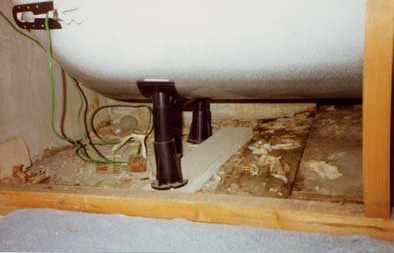 rot in the floor below the bath has caused the boards to rot and some of the end of the floor joists to