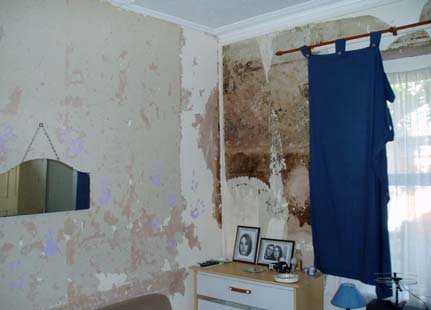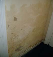 the touch) with salted and perished wall plaster and mould growth present.