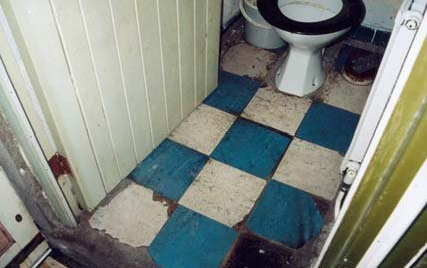 the lifting and subsequent break up of the thermo plastic floor tiles. The lid to the wc is also now