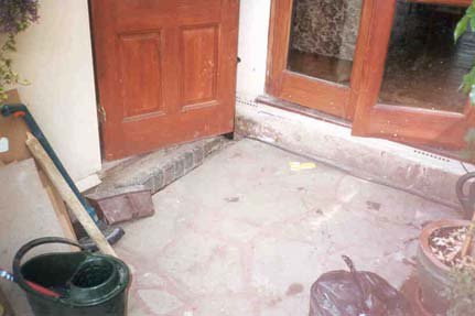 the concrete yard. They open awkwardly over respectively a single grey brick and concrete step/threshold. The