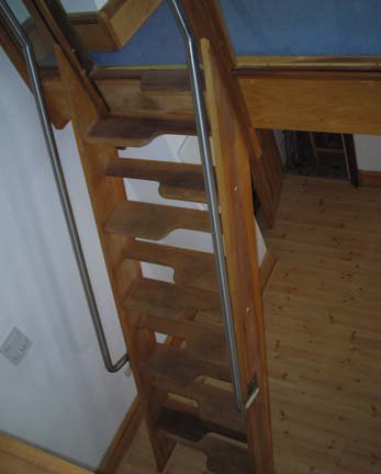 Justification: The steepness of the steps to the raised sleeping area; the open risers; the wooden floor