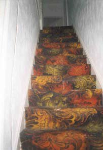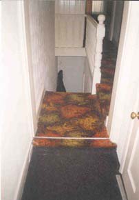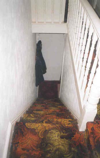 top of the stairs. There are no handrails on either side of the main flight. Directly opposite the foot of the stairs is
