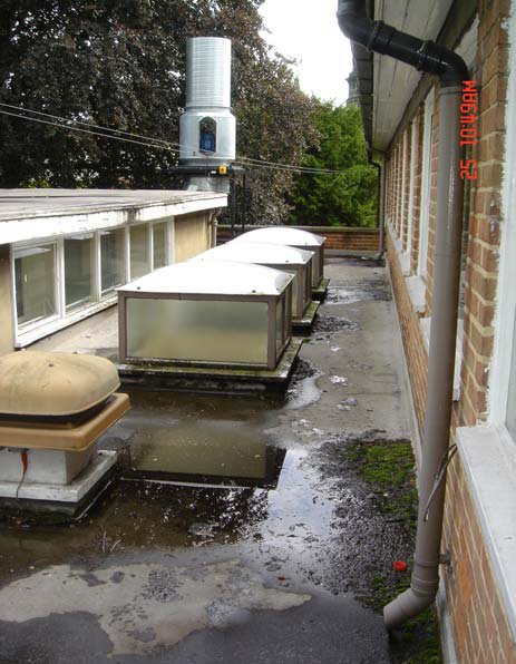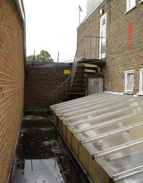 There are metal framed perspex and glass roof lights along the route, rain water discharges onto the flat roof