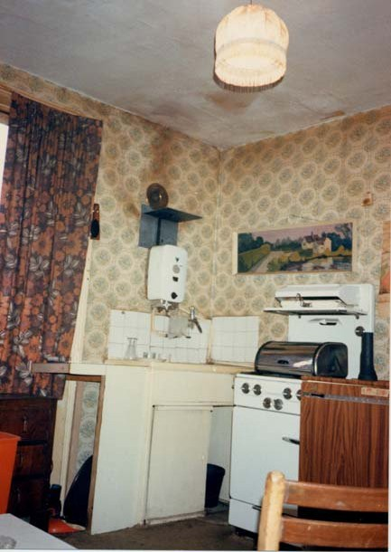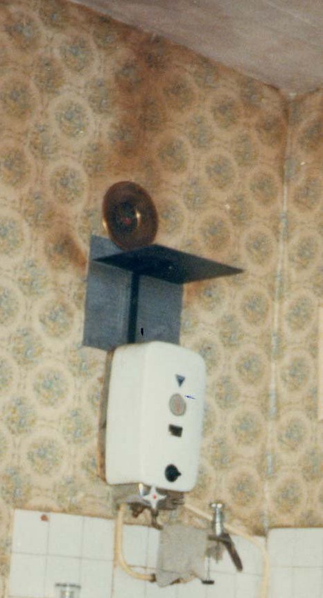 cooker. A crude metal plate and horizontal cowel have been fixed on the wall above the unflued