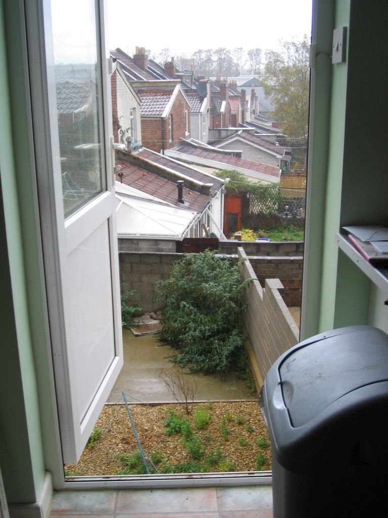 by a thumb-turn on the kitchen side. There a drop of between 2.5 and 3.0 metres from the kitchen doorway into the rear