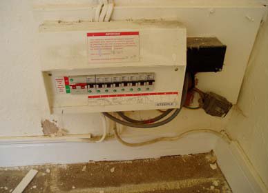 A) Living Room: low level consumber unit with missing cover. Two broken double power socket outlets.