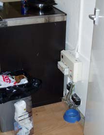 B) Kitchen: consumer unit at low level with mising cover and unsealed cable entry points.