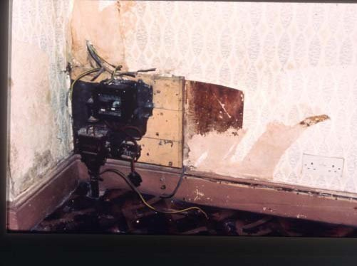 The open fusebox and exposed wiring above the meter in the hall is particularly